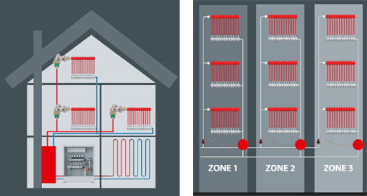 Zonierung in Verbrauchereinheiten: Im nächsten Schritt folgt die Aufteilung der Heizungsanlage in viele kleine Verbrauchereinheiten. Mit druckunabhängigen Armaturen werden die Sollwassermengen in jedem Lastfall eingehalten