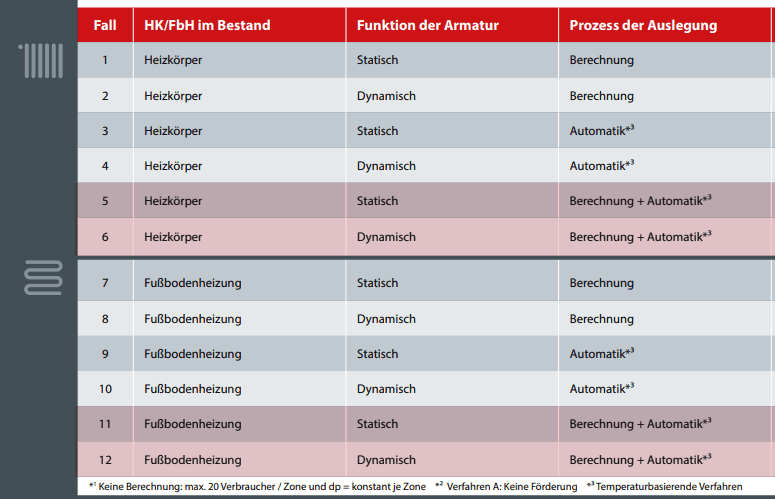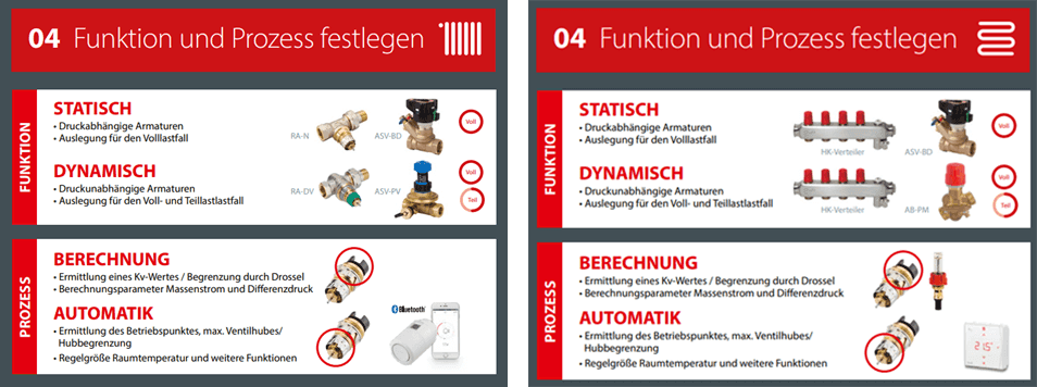 Funktion und Prozess festlegen: Durch die Funktion der Armaturen (druckabhängig oder druckunabhängig) und den Prozess der Einstellung (Berechnung oder automatisch/temperaturbasierendes Verfahren) werden die anzustrebenden Systemtemperaturen festgelegt.
