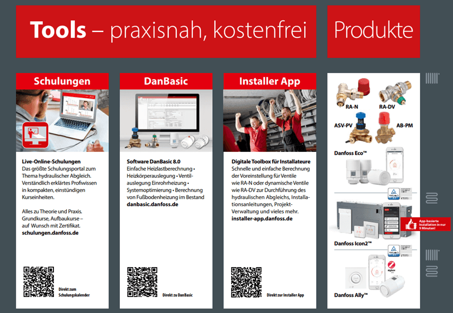 - Raumweise Heizlastberechnung: Die vereinfachte raumweise Heizlastberechnung ist Basis für jeden weiteren Berechnungsschritt (Transmissions- und Lüftungswärmebedarf, z. B. Annahme von U-Werten). Tipp: Verwenden Sie für die Berechnung die kostenfreie Software von Danfoss DanBasic.