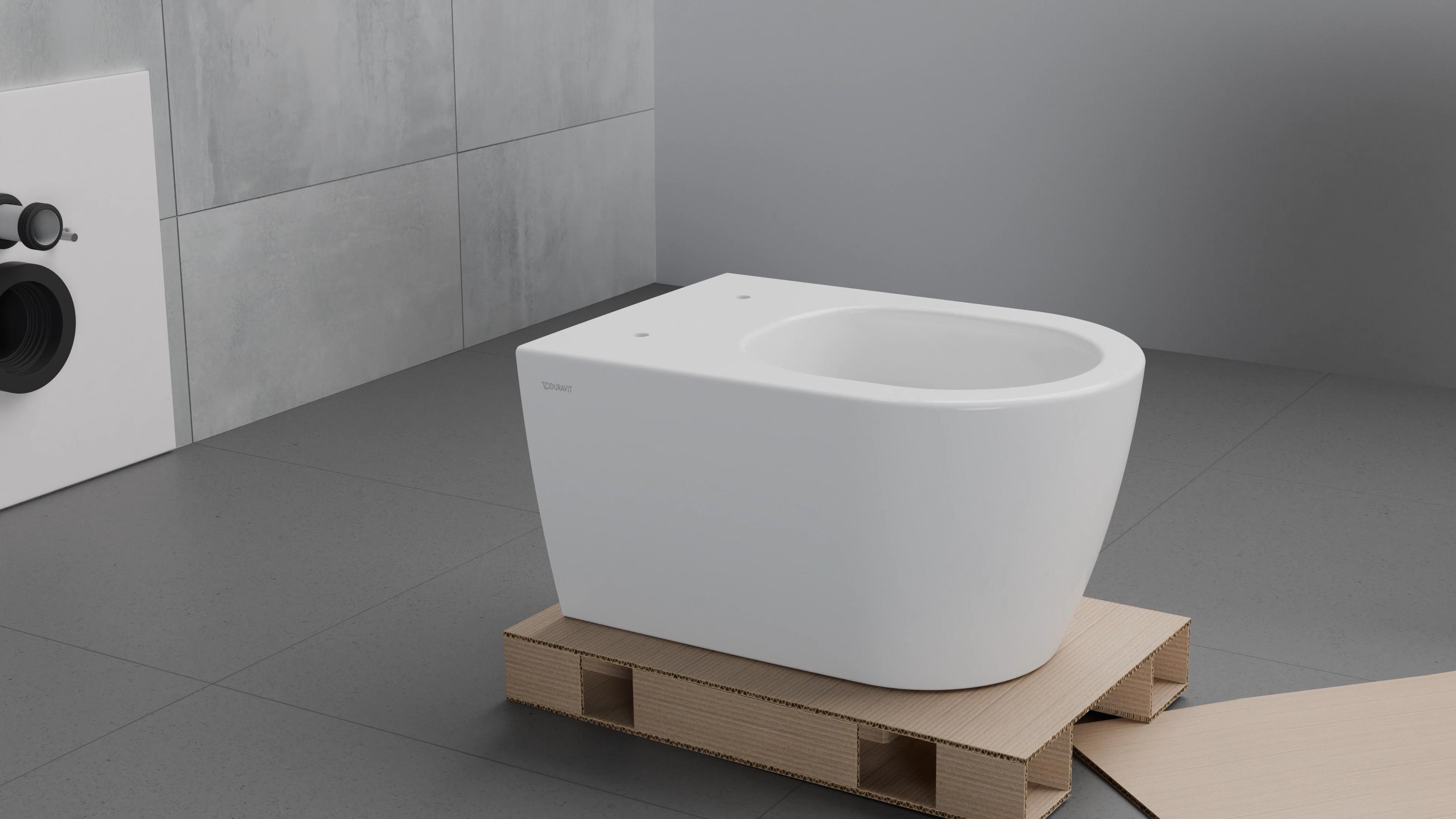 Für noch einfacheres Arbeiten hat Duravit auch die Verpackung clever gelöst: Das WC lässt sich auf einem stabilen Kartonsockel direkt aus der Verpackung schieben und mit wenig Kraft vor der Wand positionieren. Durch die erhöhte Auflage steht das WC bereits in optimaler Arbeitshöhe – so kann es ohne intensives Bücken und ohne die Hilfe einer zweiten Person einfach auf die Befestigungsschrauben gesteckt werden.