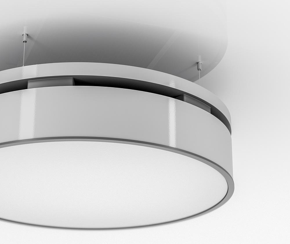 Der KaDius überzeugt durch seine Flexibilität bei der Montage: Er lässt sich sowohl knapp unter der Decke platzieren als auch freihängend montieren und fungiert damit als stilvolles Designelement. Seine runde, flache Bauform eignet sich hervorragend für die Integration in moderne Lichtkonzepte, z. B. mit Ringleuchten, sowie zur Kombination mit Akustikpaneelen für eine angenehme Raumakustik.