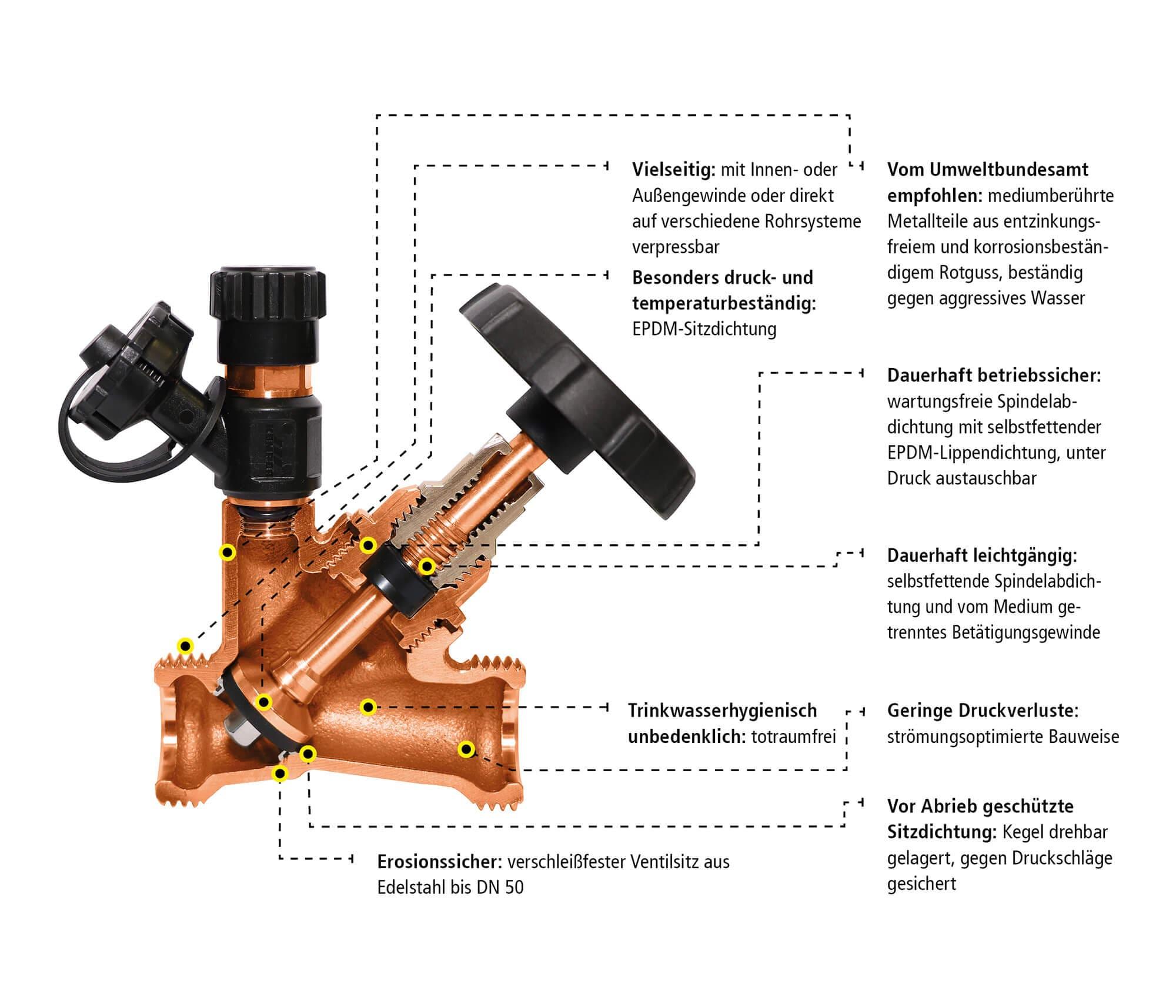 KEMPER verarbeitet seit 50 Jahren den korrosionsbeständigen und entzinkungsfreien Werkstoff Rotguss für den Einsatz in der Gebäudetechnik. Die Armaturen der WESER-Baureihe zeichnen sich dadurch aus, dass nicht nur die Gehäuse, sondern alle wasserführenden Metallteile konsequent aus Rotguss oder Edelstahl gefertigt sind.